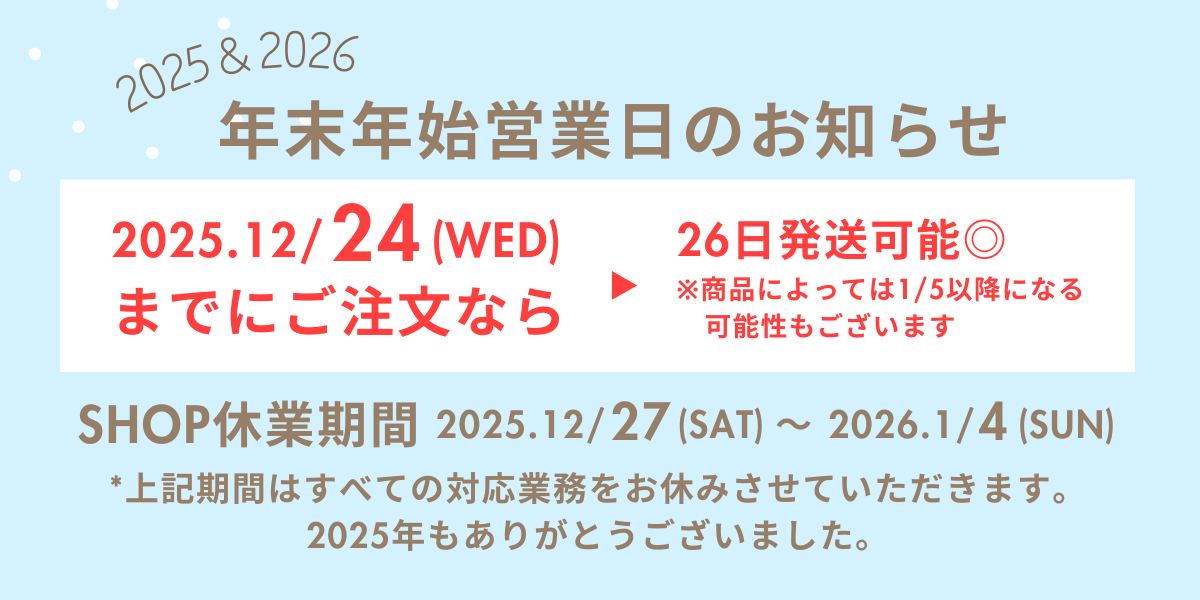土日・祝日は出荷は行っておりません。また大型連休の期間も発送作業は休止しています。お急ぎのお客様はご注文前にお問合せからご確認お願いします。